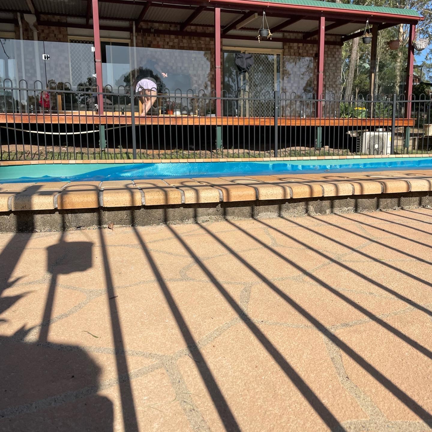 A large concrete pool at a home in Newcastle, New South Wales. The pool was surrounded by stenciled concrete slabs.