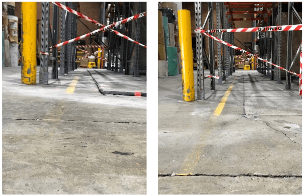 Resinject were engaged to stabilise and re-level the concrete floor that had been compromised. These affected internal slabs were pumping and deflecting with forklift activity in the warehouse, causing a potential risk to both handling equipment and operators.