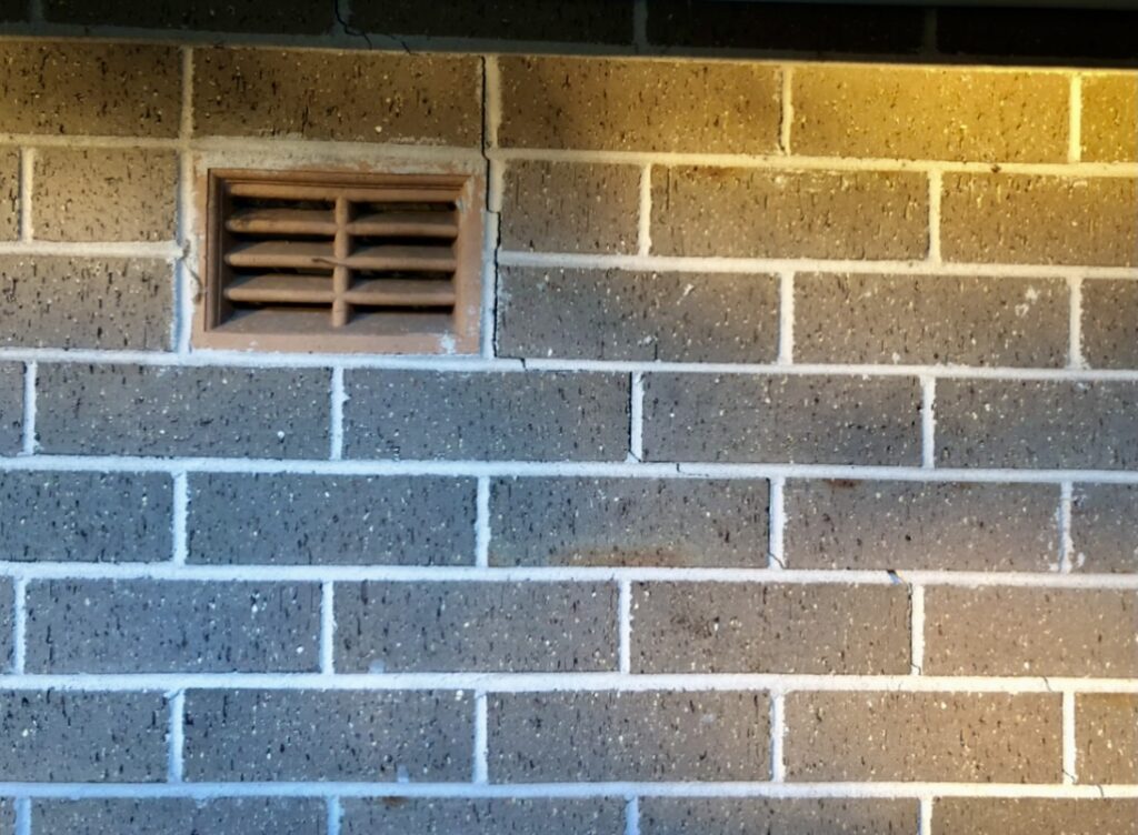 A single-storey brick veneer dwelling showing evidence of subsidence in the garage.