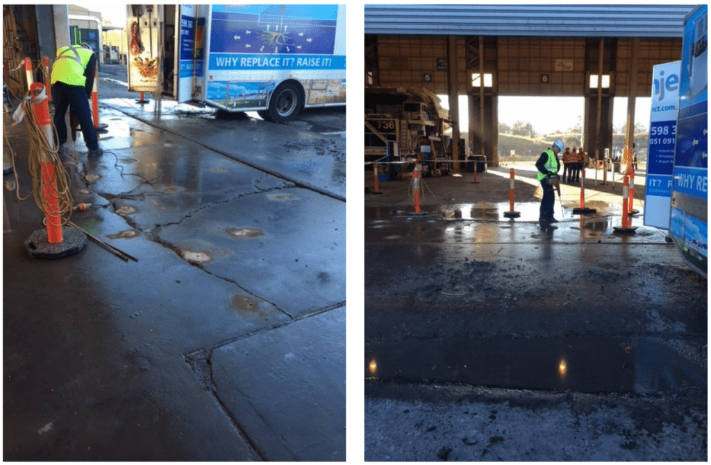 The load bearing capacity of the ground had been compromised by excessive ground water over the years, combined with the large heavy loads that slabs have had to bear. This caused the slabs to “pump” – leading to void age, in turn leading to slab subsidence and cracking of the slab.
